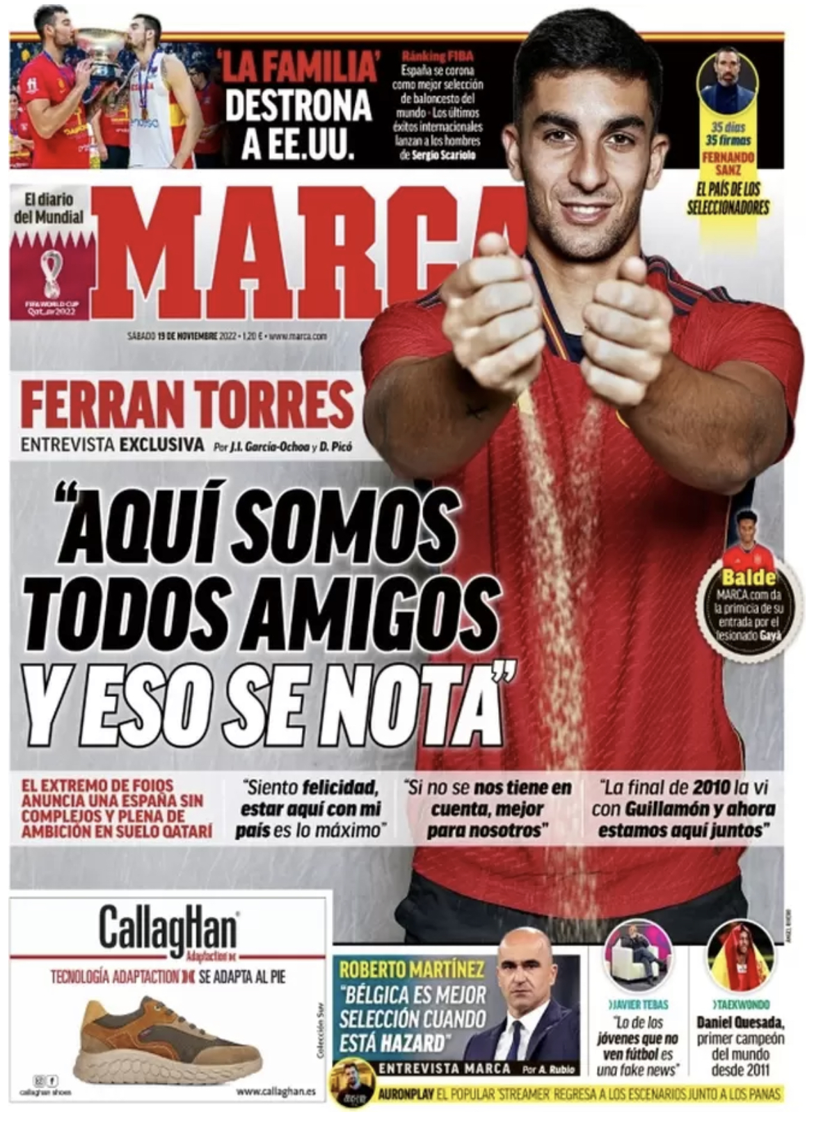 Marca publica una entrevista exclusiva a Ferrán Torres, y destaca algunas de sus frases en la portada: "Siento felicidad, estar aquí con mi país es lo máximo. Si no se nos tiene en cuenta, mejor para nosotros. La final de 2010 la vi con Guillamón y ahora estamos aquí juntos".