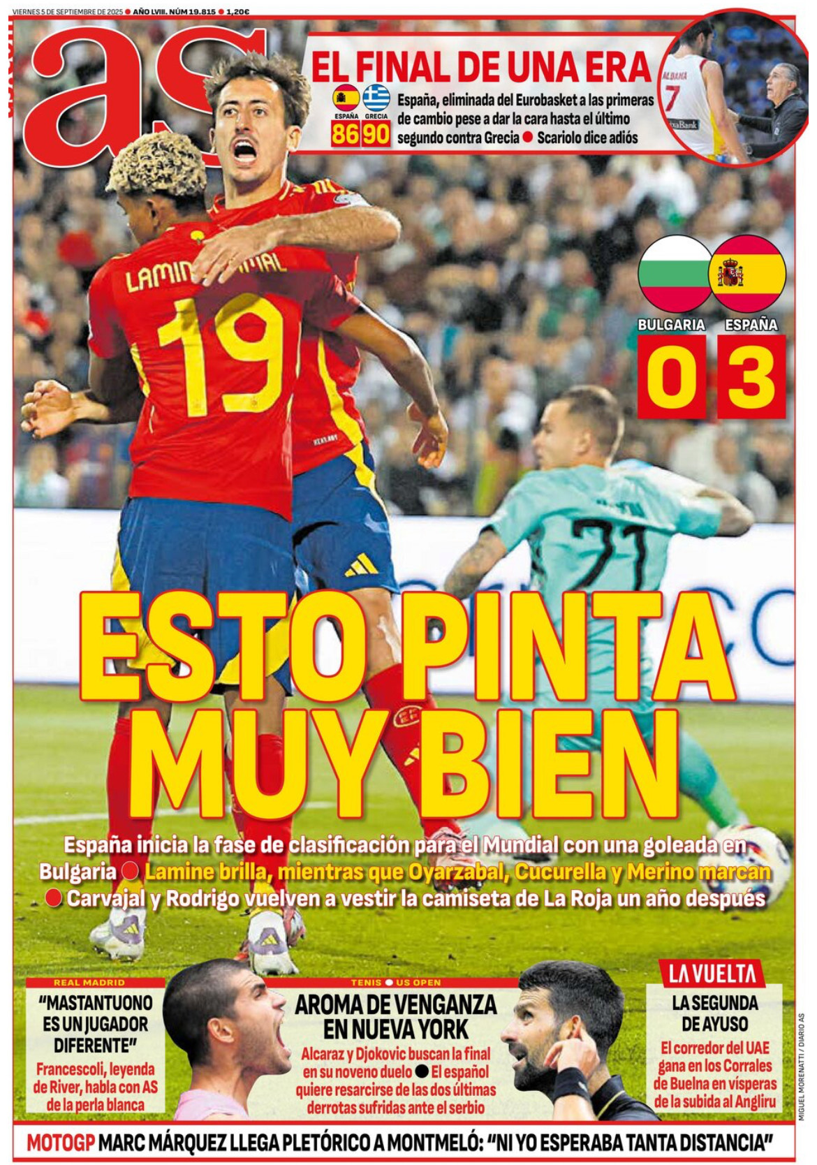 As apunta que "España inicia la fase de clasificación para el Mundial con una goleada en Bulgaria. Lamine brilla, mientras que Oyarzabal, Cucurella y Merino marcan. Carvajal y Rodrigo vuelven a vestir la camiseta de La Roja un año después".