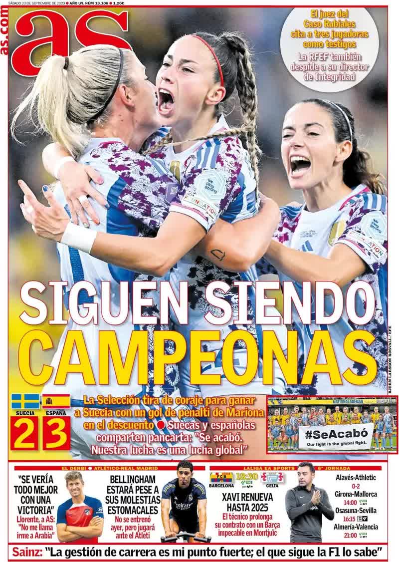 As apunta que "la Selección tira de coraje para ganar a Suecia con un gol de penalti de Mariona en el descuento. Suecas y españolas comparten pancarta: "Se acabó, nuestra lucha es una lucha global"".