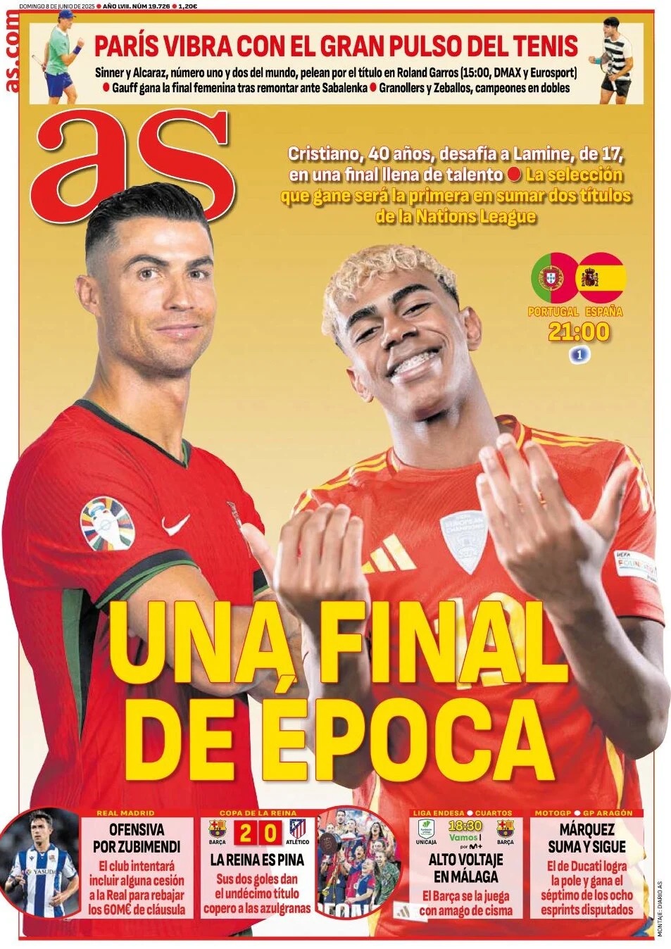 As apunta que ”Cristiano, 40 años, desafía a Lamine, de 17, en una final llena de talento. La Selección que gane será la primera en sumar dos títulos de la Nations League”
