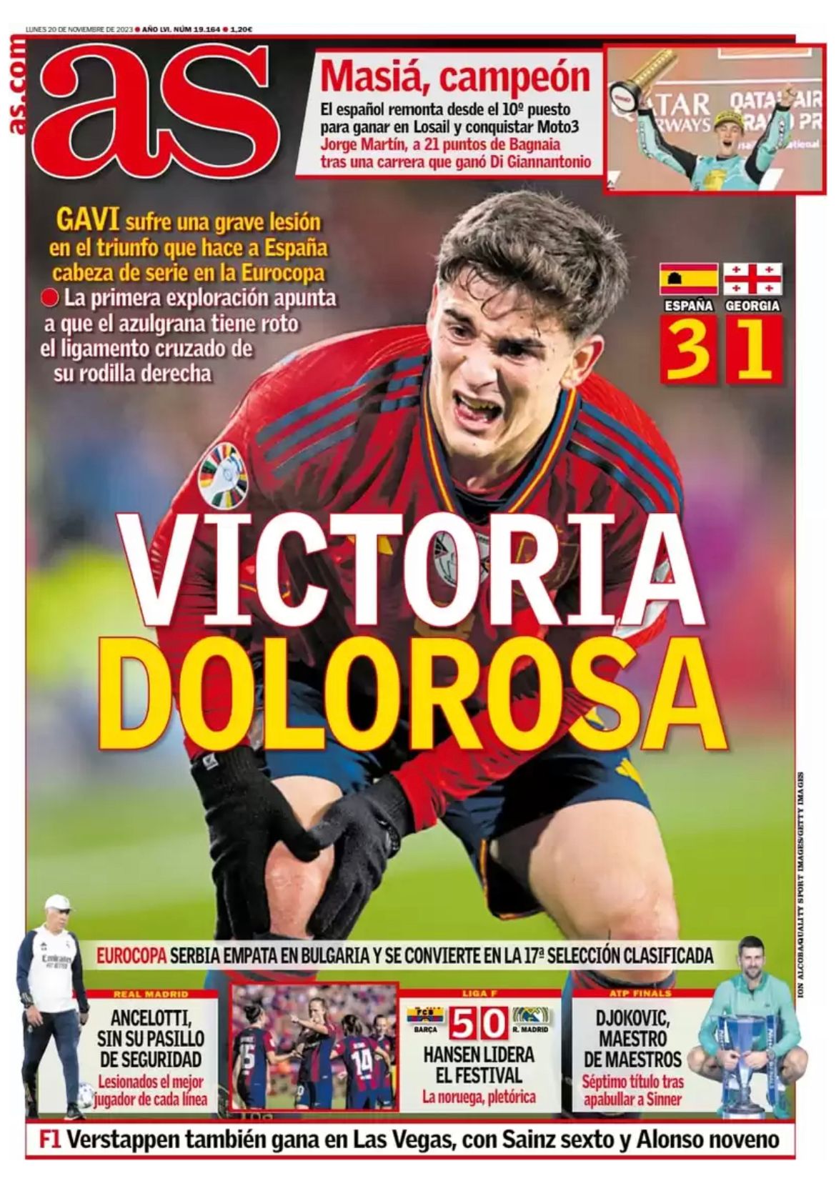 As apunta que "Gavi sufre una grave lesión en el triunfo que hace a España cabeza de serie en la Eurocopa. La primera exploración apunta a que el azulgrana tiene roto el ligamento cruzado de su rodilla derecha".