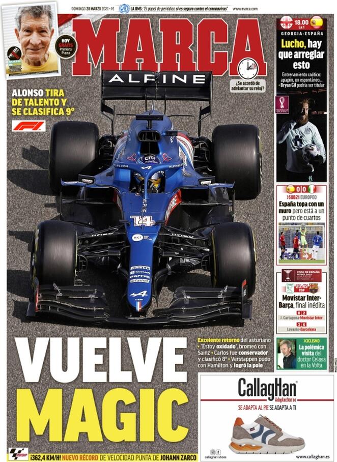 Marca dedica la mayor parte de su portada al inicio del Mundial de Fórmula 1, pero también destaca la visita de España a Georgia: "Entrenamiento caótico, un apagón, un espontáneo. Bryan Gil podría ser titular".