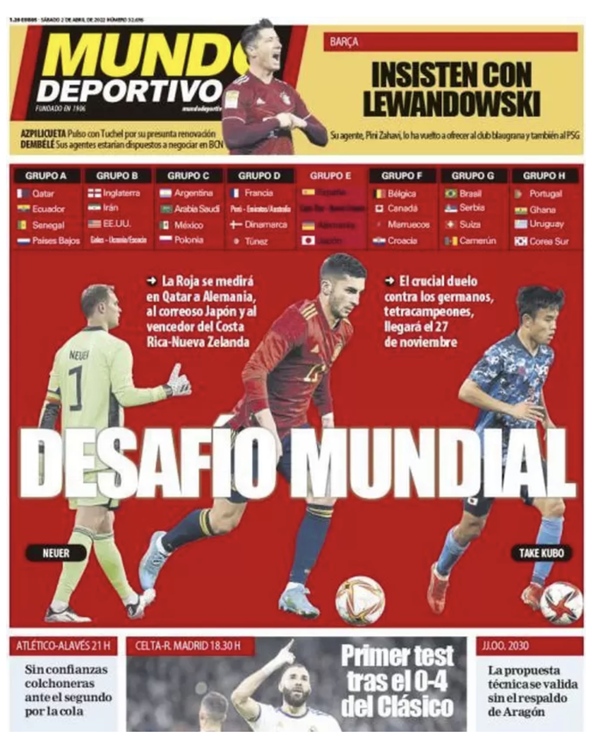 Mundo Deportivo recuerda en su portada que "La Roja se medirá en Catar a Alemania, al correoso Japón y al vencedor del Costa Rica - Nueva Zelanda. El crucial duelo ante los germanos, tetracampeones, llegará el 27 de noviembre".