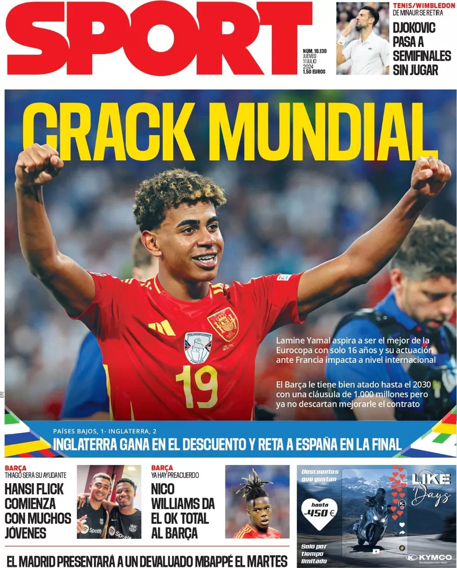 Sport publica que "Lamine Yamal aspira a ser el mejor de la Eurocopa con sólo 16 años y su actuación ante Francia impacta a nivel internacional. El Barça le tiene bien atado hasta el 2030 con una cláusula de 1.000 millones pero ya no descartan mejorarle el contrato".