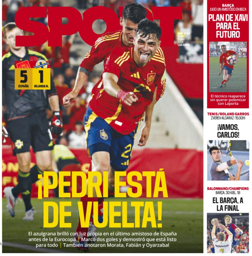 Sport apunta que Pedri "brilló con luz propia en el último amistoso de España antes de la Eurocopa. marcó dos goles y demostró que está listo para todo. También anotaron Morata, Fabián y Oyarzabal".